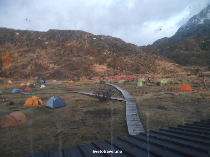 Day 3 started with me looking out the window from my room at Refugio Paine Grande to the tents that some slept in. It is incredibly hard to believe anyone could sleep in those with the high winds experienced. But, some did!