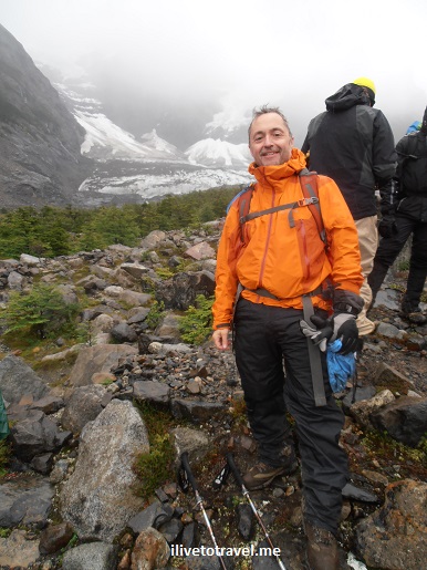 The main attraction for the day would be to see the valley of the Glaciar Francés (French Glacier). To get there, we would detour from the main route taking us from Refugio Paine Grande to our destination for the night: Refugio Los Cuernos. It would imply a very long day of hiking to the Campamento Británico (British Camp) and back out requiring a steep climb. I was not sure I would have the energy for the very long day that would result from the hike (a total of 15 miles in about 10 hrs) but was not going to miss it if the group went (always a good motivator!). But the weather made the decision for us. Visibility was going to be too low for the trek to the valley to be worth it. However, our leads suggested that we hit the “mirador” spot from which one could, at least, see the glacier. After a lunch stop at the Campamento Italiano (Italian Camp), we left for the mirador, despite slight rain, and it was a nice compromise worth the trouble (about an hour roundtrip – not bad!). We also saw the Paine Grande Glacier above the French Glacier.