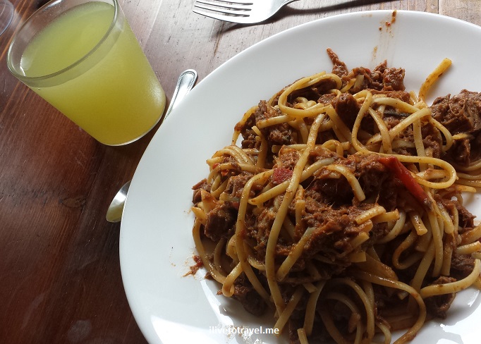 We made it back to the Refugio Grey after the glacier hike. There we enjoyed some lunch prior to getting going on part two of our day: hiking back to Refugio Paine Grande, where we had landed by boat the day before. The lunch was a delicious plate of spaghetti and meatballs as you can appreciate from the picture below!