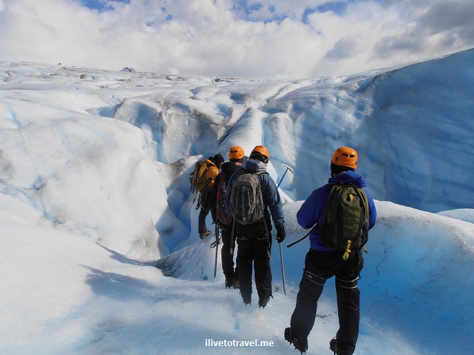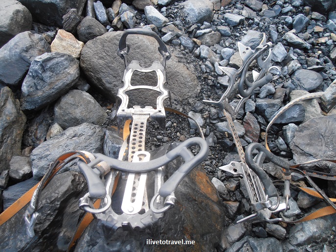 In any case, we got on the glacier proper and we were excited to get to the spot where we would enter the ice field. At that spot, the gear was waiting for us. A brief presentation showed us how to walk on ice and not die – or something like that. Then, we proceeded to put on the crampons (mine looked like Peary or Amundsen used them over 100 years ago in their epic hikes through ice…), learned to use the ice pick, and climbed onto the ice.