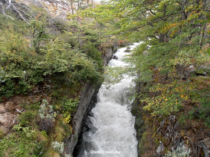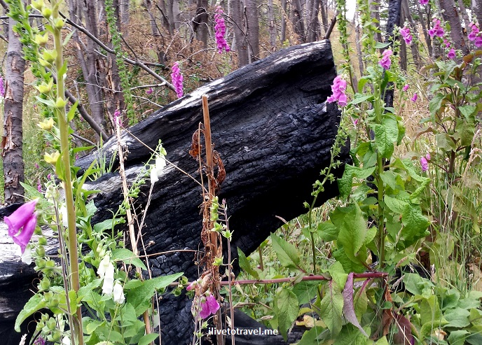 We got on our way to Refugio Grey around 2 PM.Β The landscape started a little on the bland side and then we moved through forest of burnt trees before stepping back into the beauty of life with purple, pink and yellow flowers as we bordered lakes.