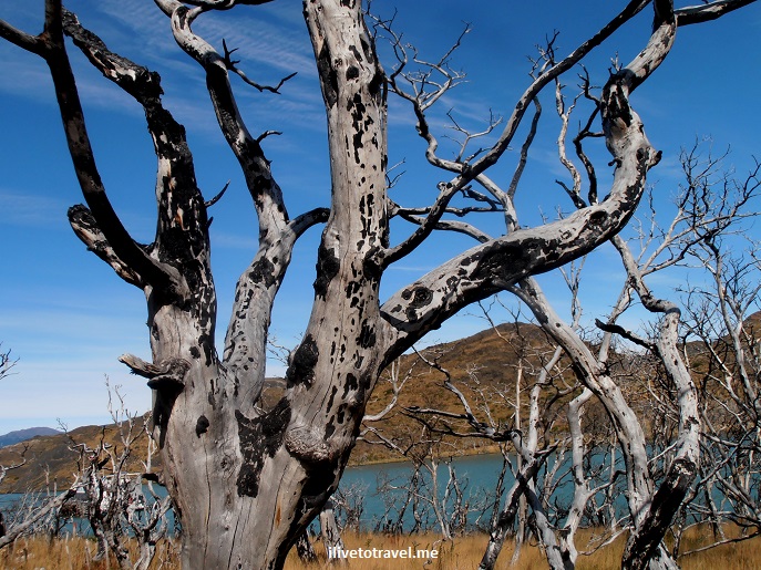 This boat ride would take us to the Refugio Paine Grande, the starting point in our hike.Β Right at the departure “port,” we saw evidence of the fires that ravaged the area a few years ago.Β The trees were reminders of the fragility of the environment there (or anywhere, for that matter).
