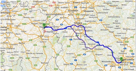 Today, I share my drive to/from Maastricht, The Netherlands and Frankfurt, Germany over a dozen years ago. I was in Frankfurt for business for a few weeks and decided to visit a college friend who was an ex-pat in Maastricht. I rented my car in Frankfurt and made my way, in about 3 hrs, to Maastricht on the famous autobahn. The autobahn between some cities in Germany fails to meet the wild expectations we have in the U.S. about fast speeds as there is too much vehicular traffic on some of the routes. But some parts of the route I took where free and clear just for me. That and along the Mercedes-Benz upgrade they gave me were the perfect pairing for a FUN drive. On the outbound leg of the trip, I drove northwest towards Bonn and Cologne (Köln) on the A3 and then west on the A4 past Aachen straight into Maastricht. I wish I had had time to explore Aachen, having been a residence of Charlemagne and where many Holy Roman Emperors were crowned back in the day. For that matter also Cologne and Bonn. So much too see and so little time…