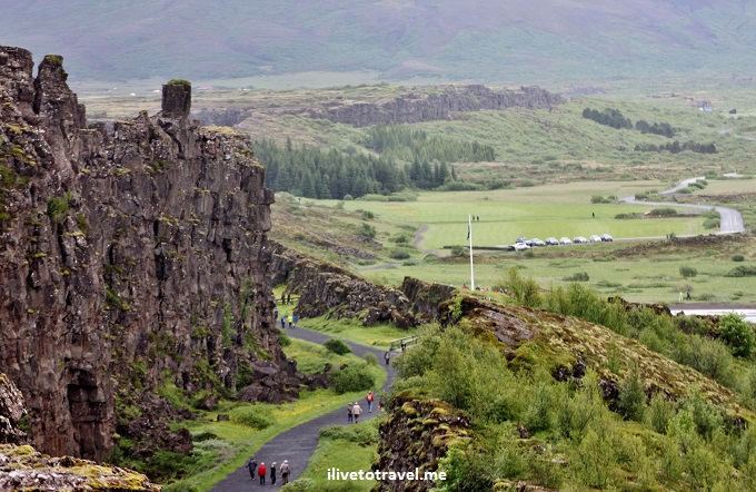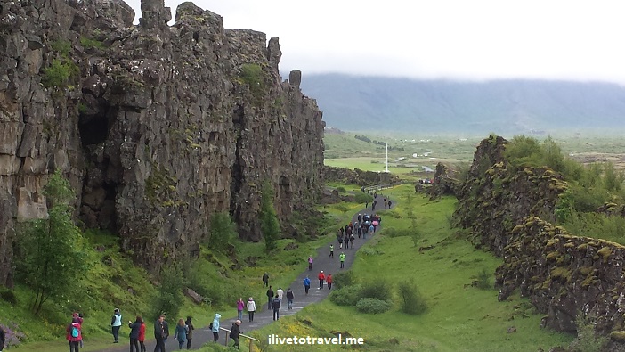 The park is also the home of the largest lake in Iceland and it contains the crest of the rift valley in the mid-Atlantic. As you walk in down a paved path, a large cliff wall on your left frames the scene. It is an imposing wall!