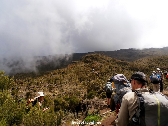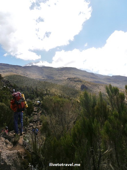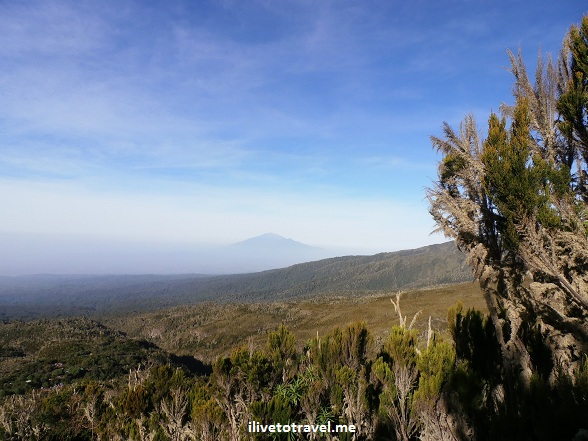 After the morning routine was done (eating breakfast, filling up with water, packing up our bedding and other stuff, etc.), we left the Machame Camp. We departed early in the morning around 7:45 AM under a great and beautiful blue sky. As we left, we could see neighboring Mount Meru in the distance which served as a great backdrop to our photos of the scenery around us.
