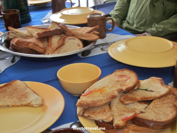 So, quickly switching topic… On day 2 we had one of our many favorite lunches of the whole climb: grilled tomato, cheese and cucumber sandwiches! The picture below will not do these sandwiches justice. They were a real treat and we gobbled up all these babies up happily! We also likely were served a soup (we typically were in every meal). However, the type changed every time they served it and I did not jot down what accompanied these beauties below.