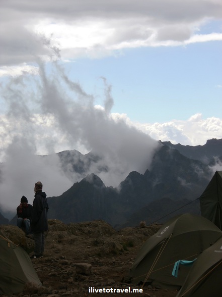 One of the spots with the best view of the Shira Ridge was not only a great spot for a photo opp but it also seemed to be the best spot for a cellphone signal as a few guides would sit on the nearby rocks and text away for a while. This spot also happened to be like within 10 ft (3m) from the toilet-tent nearest to my sleeping tent; the toilet-tent being a place I would visit a couple of times during the night as Diamox (the med you take to help prevent altitude sickness) is a very effective diuretic…