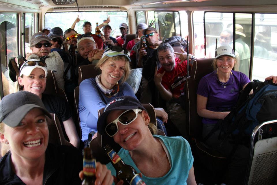 However, one of my fellow trekkers eyed a beer seller. He looked at me and, of course, I wouldn’t leave a buddy drinking on his own. Especially after a week of no alcohol and a hike of 3 hours… That’s when the first beer was bought. Others in the group looked at us like “really?” Fast forward 20 minutes and most everyone had a beer in their hand! And off we went to the bus, to get to the Springlands Hotel and back to being clean!!!