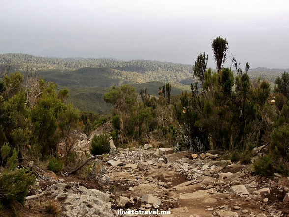 Pretty quickly after leaving Barafu Camp the second part of our descent from Kilimanjaro’s summit on day 6 became a nightmare of sorts. Though the views were great most of the time, the terrain was so rocky that you had to navigate carefully (at least for those of us not super experienced) and you could not really enjoy the vistas. Some of us started feeling that our knees were being hit hard (read: pummeled) and had to slow down some. My legs were extremely tired at this point. And my knees, though not hurting yet, were wearing out with every step.