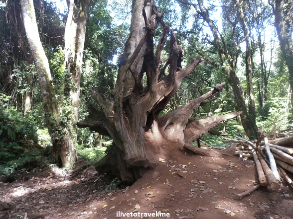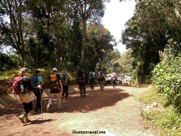 We trekked down for maybe about 3 hrs from an altitude of 10,000 ft or so to the Mweka Gate at an elevation of 6,000 ft (3,800 m). The climate zone went to full forest again, as we had experienced on day 1 and the moorlands were done. The clothing was lighter and so was our mood. Someone even rode the emergency stretcher that was laying about during one of our breaks…