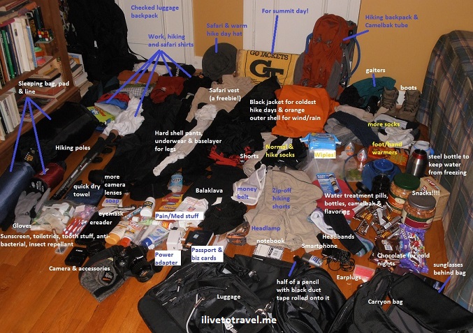 Climbing Kilimanjaro is quite the experience – an achievable one for most people with some training and mental readiness for the effort. But climbing to the “roof of Africa” is also an operational endeavor! Lots of planning for the clothing and other items that are needed. This while balancing needs, cost, and weight. The following picture sort of gives you a visual of the amount of stuff that my Kilimanjaro packing list included.