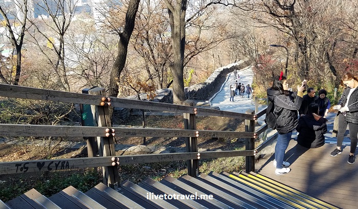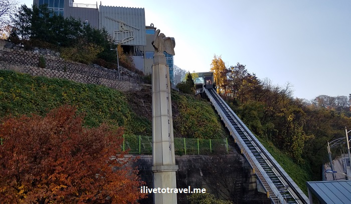 The cable car, luckily as I did not plan this, was just two blocks from my hotel near the Myeongdong subway station. To get to the cable car lower station, one either climbs a series of staircases (quite steep), or one takes a short tram. However, the tram had weekly maintenance that morning so it was not an option. So up the stairs I went! Good workout…