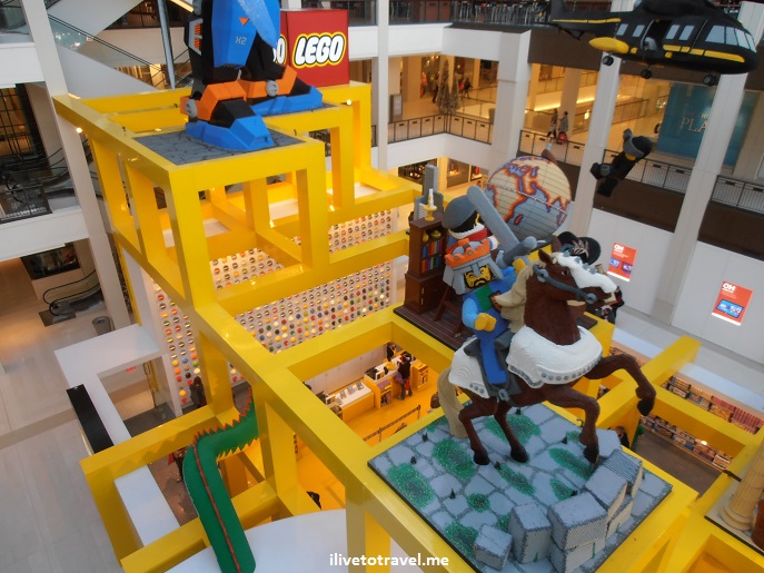 There are tons of stores from locally-headquartered Best Buy to Eddie Bauer (my favorite clothes) to tourist souvenir shops to large department stores to boutiques to Apple and Microsoft stores (that almost face each other across the aisle!).Β There is every kind of shop you could be looking for.Β But my favorite shop is the Lego store!!!Β Pieces and sets galore as well as some massive pieces hanging up high!