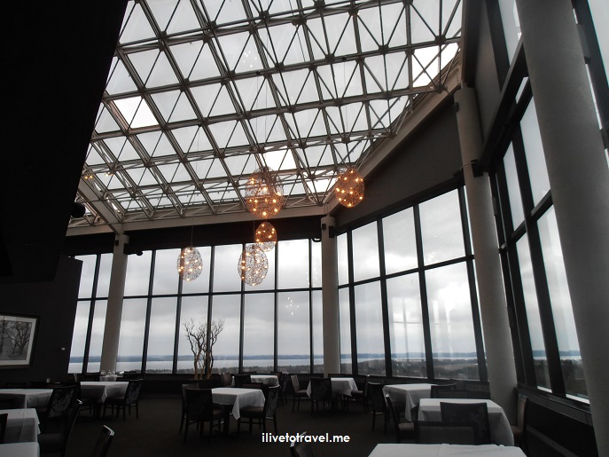 Recharged, I decided it was time to discover some Michigan wines since I had never tried one before. Yes, I had planned to taste some wines the next day as part of Leelanau Peninsula’s Sip & Savor festival but I am nothing if not a student and a learner, so no harm in pre-research 🙂 The resort’s up-high restaurant and bar, the Aerie Restaurant and Lounge, sits on the 16th floor of the tower at the Grand Traverse. I really liked the openness of the bar and restaurant with great views of the East Grand Traverse Bay and the golf course at the resort. Unfortunately, it was cloudy that day so the setting’s incredible sunset views were not going to happen for me but I can only imagine how spectacular the sunset must be from up there.