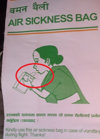 Upon boarding, I looked into the seat pocket in front of me and found the air sickness bag which left no doubt as to what its purpose was… I should have taken it with me but at least I took a picture of it.
