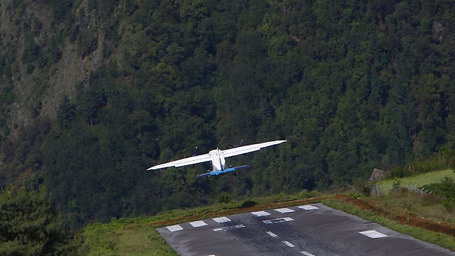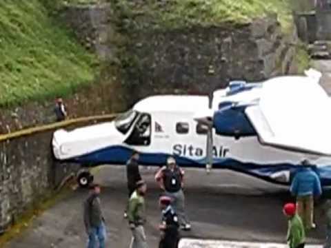 On the reverse (the takeoff out of Lukla), either the plane catches air at the end of the runway where the runway meets the cliff’s edge, or it drops when the runway runs out until the plane catches lift (which I would hope it does…).