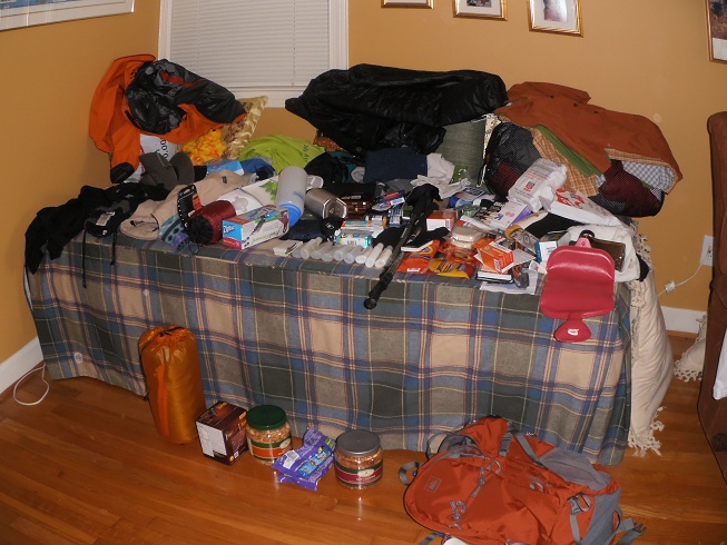 After being in good conditioning for the hike, the next item on the list is all the stuff that I will need on the hike. That short word “stuff” covers a wide range of things that I will need to make this a successful trip. After getting the packing list from TFK (VERY thorough!), I did an inventory of what I had and what I needed to research/acquire. I started staging all my items in a spare bedroom. It looks like a mess but it does two things for me: 1. allow me to start gathering in one place all that I will need to pack making packing later a lot easier and 2. allow me to start enjoying the upcoming trek by seeing it shape up!