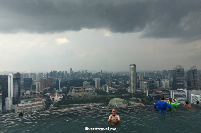 The next day, when we got to the pool in the early afternoon, the skies were incredibly dark. I expected the storm to come our way and the pool summarily closed. So with no time to waste, I urged my friend Phil to jump in quickly so I could snap his photo and then we would swap places and at least we each would have “the” picture of the city behind the edge of the infinity pool.