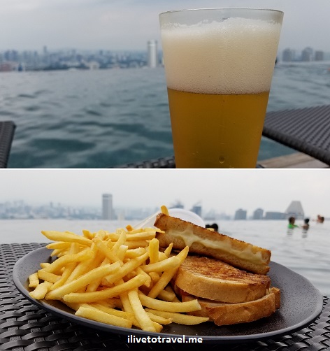God smiled upon us. Not only did lightning NOT strike while we were in the pool for the prize-winning photos, but the storms stayed away and we got to enjoy a whole afternoon poolside, even if under a cloud cover. Lunch and drinks were part of the picture as was people watching – and some pretend-jumps off the pool into infinity.