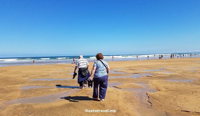 The beach was long (I read it is about 2.8 km long; the longest in that coastline) and we could certainly see how it would be an appealing tourist destination. The beach was not packed and it may be that it was likely already the end of the season (but finding street parking was impossible still!). We sat in the plaza above the underground parking deck and looked out at the beach and ocean. My Mom, uncle and I decided to walk down to get our feet wet by the waters of the Bay of Biscay as maybe our ancestors did somewhere up or down that coast many centuries ago…