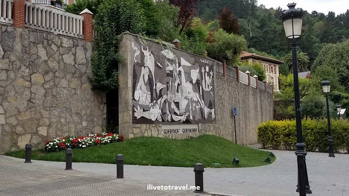 After lunch, on our way to Andraka, we made it a point to drive through the town of Guernica which suffered a massive air attack during Spain’s Civil War in 1937 by Nazi Germany, a bombing that lasted about 2 hours. Picasso captured the pain and horror of that moment in history in a famous painting named after the town. There is a mural in the town center matching the painting. We did not plan to get out of the car but I did snap a quick side photo of the mural…