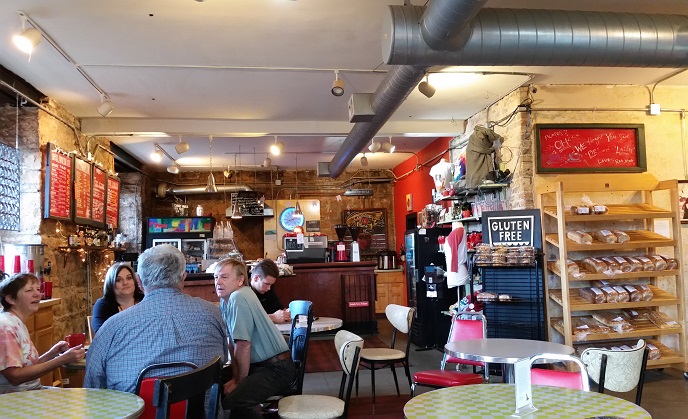 So, we needed kind of something to go see in Superior or something to do other than drive in and drive out. So, in this world of smartphones, that was an easy thing to solve: find a coffeeshop. We lucked upon one right on the same road fed by the bridge (I-535) in a turn-of-the-century (two century switches ago: 1890) stone building labeled City Hall. The building may or may no longer serve as city hall but it is impressive enough to be one. Anyway, the coffeeshop was the Red Mug Coffeehouse and Bakery on the corner of Hammond and Broadway in the basement of the building.